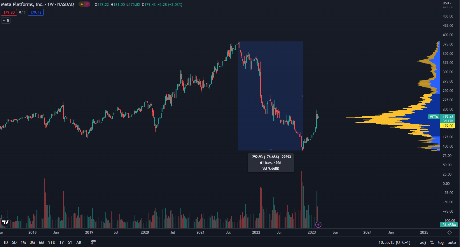 Akcie Meta v roku 2022 pripomínali trh s kryptomenami, keďže korekcia spôsobila znehodnotenie až o neuveriteľných 76 %. Zaujímavosťou je fakt, že presne rovnaký prepad zaznamenal aj bitcoin. Dňa 31. októbra 2022 akcie dosiahli minimum 88 dolárov a odvtedy narástli na súčasnú cenu 179 dolárov a ich hodnota sa zdvojnásobila.