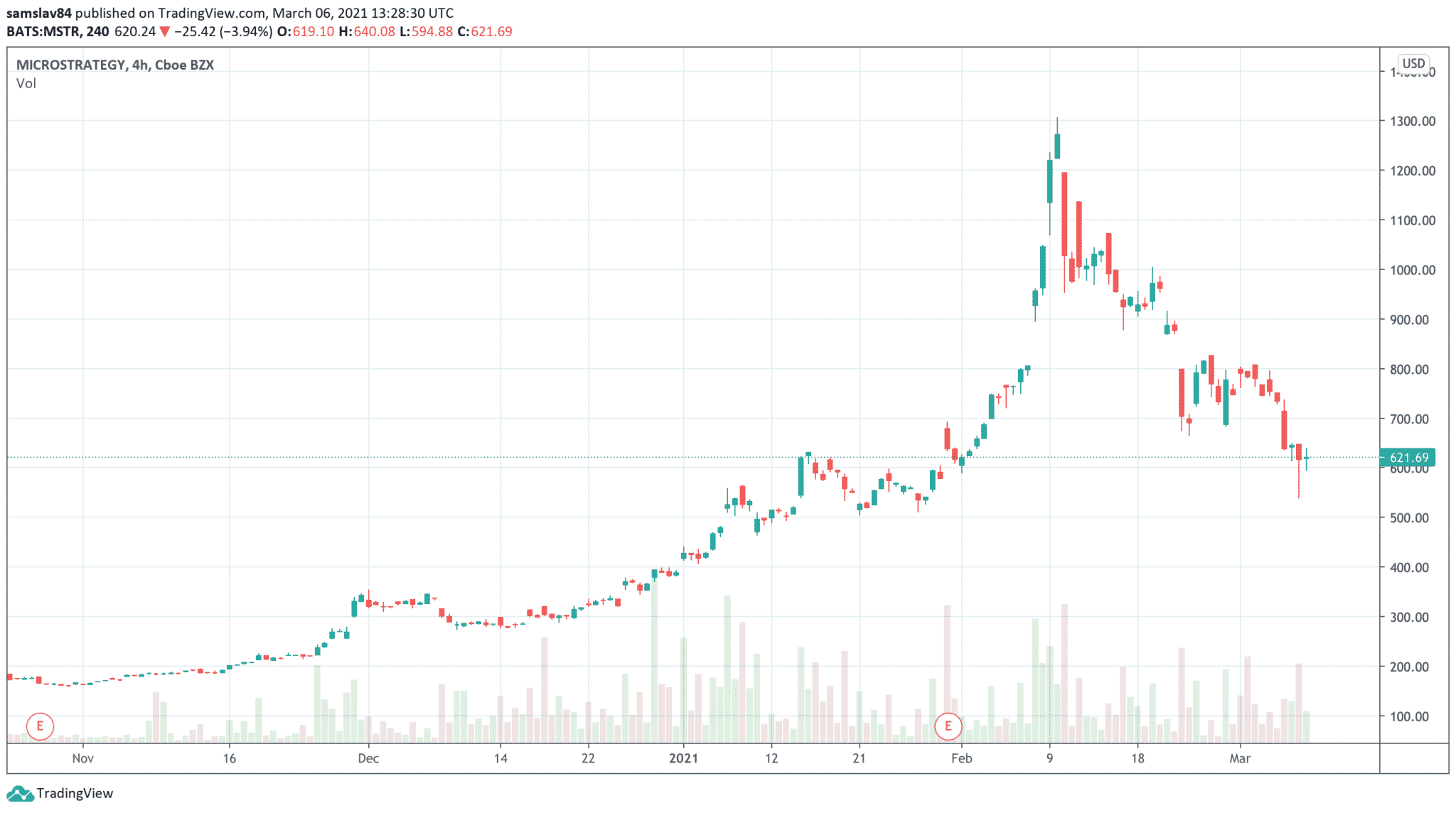 Z historického maxima 1304 dolárov klesli na súčasných $620, čo je viac než 50% prepad! I keď, je vhodné poznamenať, že cca tak vysoko sa obchodovali na konci januára a ešte v novembri bolo možné jednu akciu kúpiť za 150 dolárov.