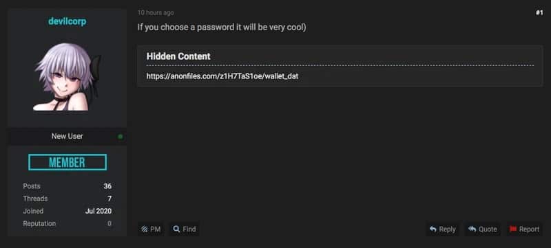 Zašifrovaná peňaženka sa na internete objavila v júli 2020 na známom hackerskom fóre RaidForums. Užívateľ pod pseudonymom devilcorp zašifrovaný súbor s walletkou zverejnil so slovami „ak uhádnete heslo, bude to naozaj cool.“