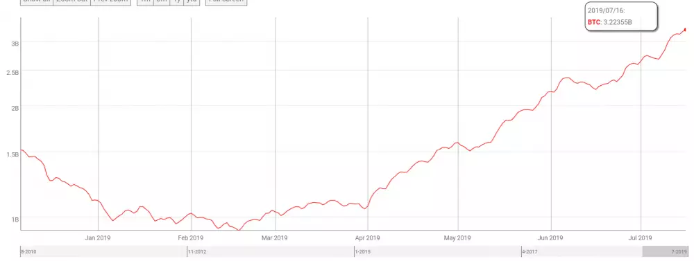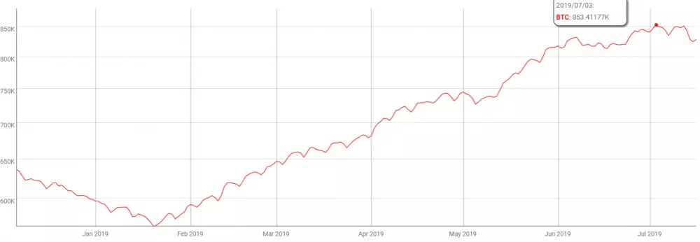 Súčasný trend rastu ceny Bitcoinu nespôsobil len nárast presunu mincí, ale aj počet aktívnych peňaženiek. Kým koncom januára tohto roka bolo aktívnych len 570 tisíc peňaženiek, tak aktuálne od začiatku mesiaca je to už viac ako 800 tisíc. Dokonca 3. 7. 2019 bolo aktívnych až 853 tisíc.