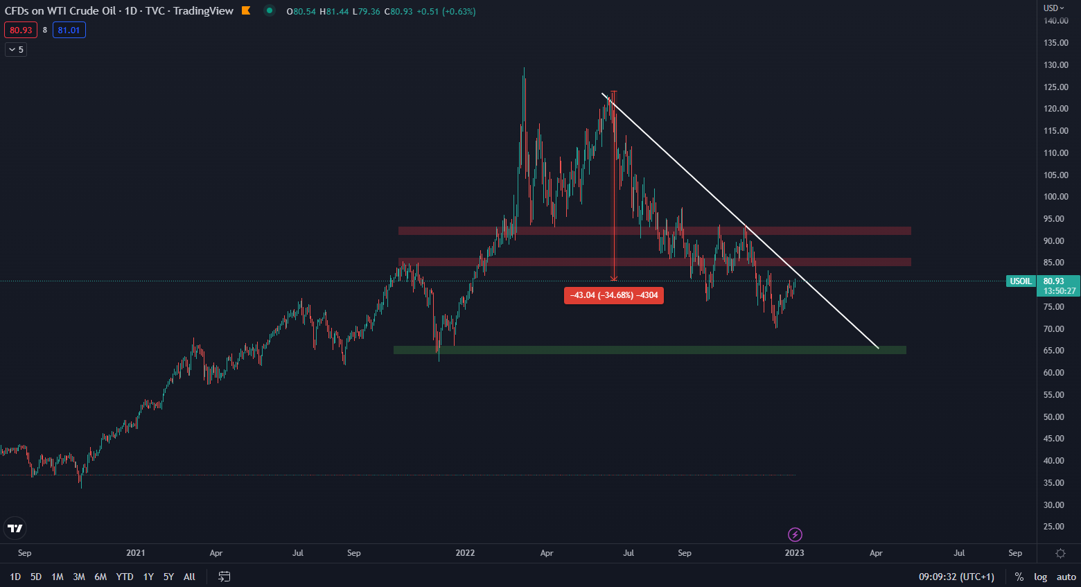 Ako vidíme podľa údajov z TradingView, cena ropy WTI sa nachádza na hodnote 80 dolárov za barel, čo je v porovnaní s júnom 2022 o 35 % nižšie. Zdá sa, že prvotný chaos je zažehnaný a ceny sa pomaly, ale isto stabilizujú v oblasti menšej volatility. Zároveň cena čelí kľúčovej rezistencii z maxím korekcie.