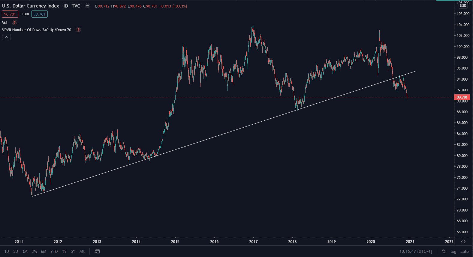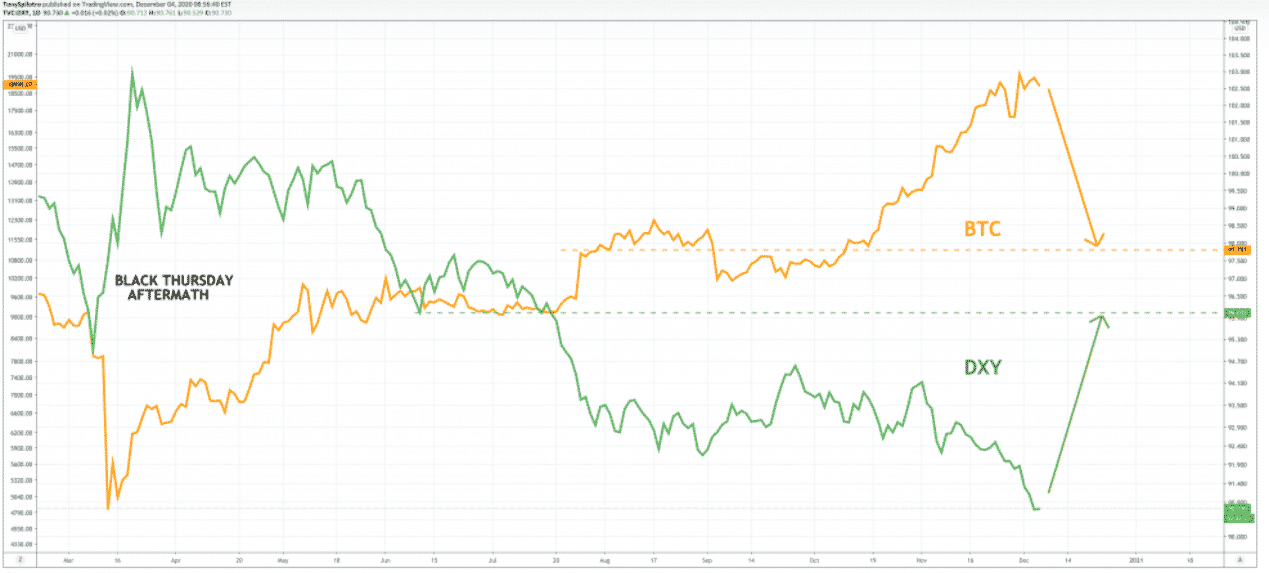 Bitcoin sa stal v roku 2020 najvýkonnejším aktívom voči doláru a tento trend pravdepodobne bude pokračovať aj do budúcnosti. Z krátkodobého hľadiska však Index DXY Dollar Currency môže signalizovať zvrat.
