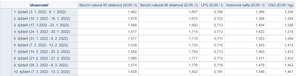 Nasledujúca tabuľka zobrazuje aktuálny vývoj phm (benzín a nafta) na území SR od začiatku roka 2022.