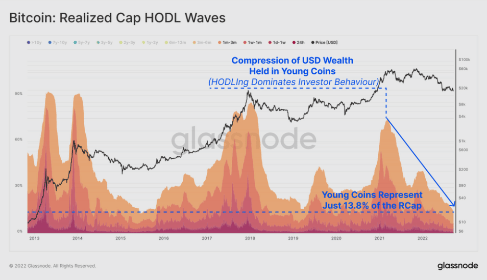 Metrika Realized Cap HODL Waves rozdeľuje držiteľov Bitcoinu podľa toho, ako dlho držia svoje mince. Zobrazuje bohatstvo v dolároch držané jednotlivými vekovými skupinami. Ako vidíme na grafe nižšie, graf zobrazuje skupiny držiteľov, ktorí nepredali svoje mince maximálne 3 mesiace, a preto reprezentuje krátkodobých investorov. Keďže podiel krátkodobých držiteľov klesá a je nízky, zvyšok trhu budú tvoriť dlhodobí držitelia, ktorí v priebehu roku 2022 stále viac dominujú.