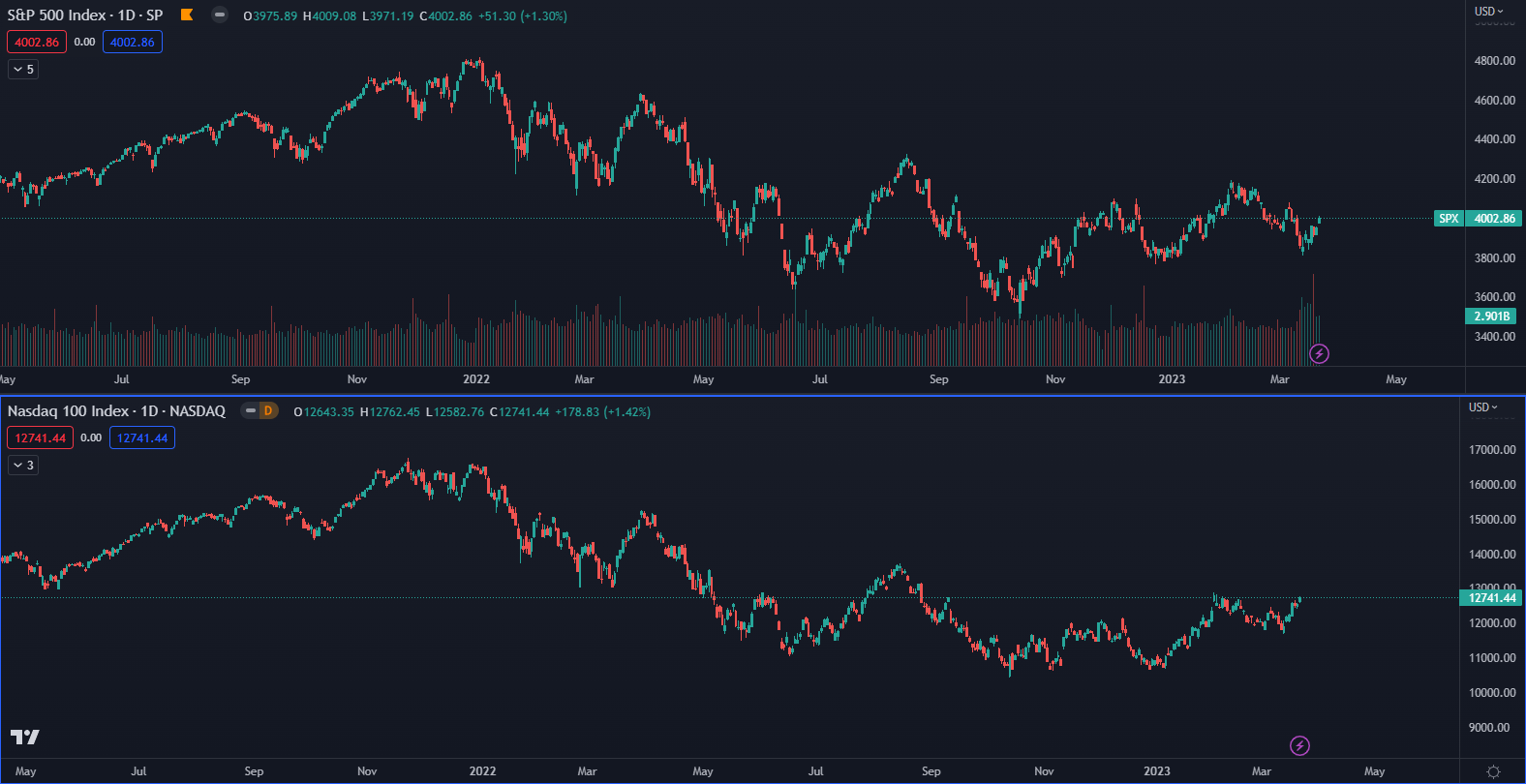 V čase písania článku sa index SPX obchoduje na cenovej úrovni 4 000 bodov, pričom v roku 2022 vytvoril korekciu až 27 % a v súčasnosti je od maxima nižšie o 17 %. Nasdaq klesol v roku 2022 až o 37 % a v súčasnosti ho delí od historického maxima korekcia v hodnote 24 %. Cena ropy sa obchoduje na najnižšej úrovni od decembra 2021 a nachádza sa o 45 % nižšie od vrcholu z marca 2022.