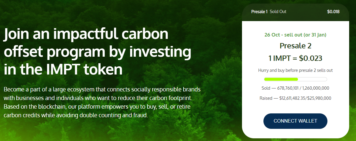Kryptomena IMPT sa zameriava na ekologický program zníženia uhlíkovej stopy jednotlivcov i spoločností. Zaujímavosťou je, že spoločnosť IMPT získala milióny dolárov počas prvých dní predbežného predaja a spolupracovala s niektorými z najväčších spoločností na svete: Acer, Netflix, LEGO a Samsung. Predpredajný žetón fázy 2 v súčasnosti stojí približne 2 centy.