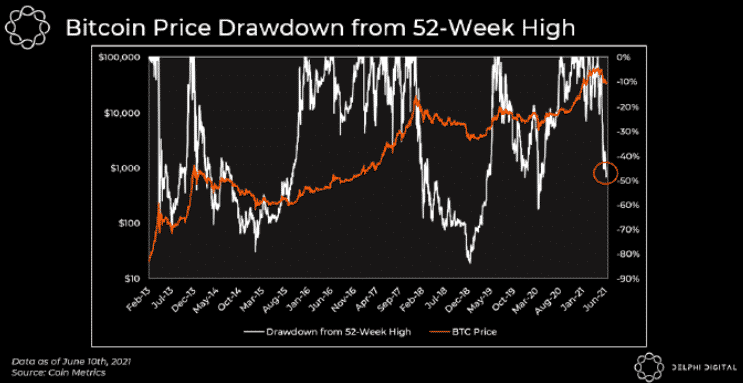 Na grafe od Delphi Digital môžete vidieť, že hodnoty drawdown sa štandardne dostávajú na úroveň -70%, najmä po väčších nárastoch ceny. Na tento fakt si musíme dať pozor, keďže neustále dochádza k veľkým súbojom medveďov a býkov na úrovni 30 000 USD.