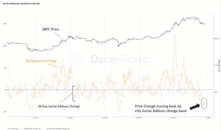 Indikátor sentimentu aktívnych adries porovnáva zmenu ceny za 28 dní, ktorá je znázornená oranžovou čiarou, s 28 dňovou zmenou aktívnych adries na reťazci, tá je uvedená sivou čiarou.