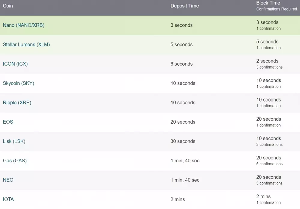 V nižšie priloženej tabuľke je vidieť, že ak chcete svoj prevod uskutočniť takmer okamžite (do jednej minúty), máte na výber len zo siedmich kryptomien. Na chvoste tabuľky sa zo zaujímavých projektov nachádza napríklad Komodo, ktorého aktuálny čas prevodu zaberá až dve hodiny.
