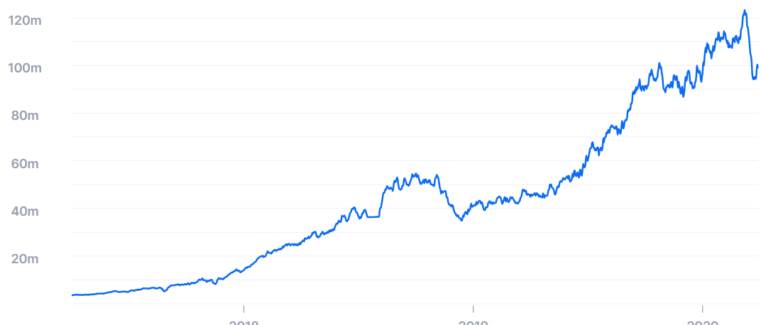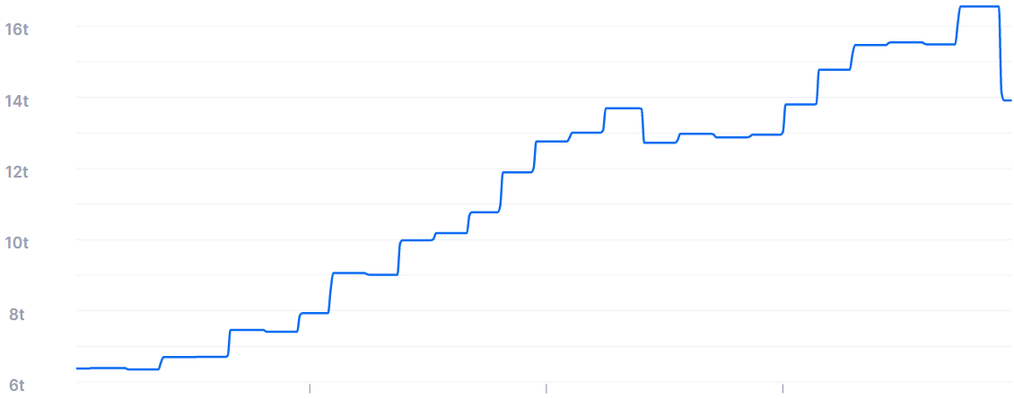 Hashrate siete padol z high (131 exahashov) na súčasných 90 exahashov. Low sme však zaznamenali na 80 exahashoch. Celkovo teda výkon siete klesá rýchlejšie, než obtiažnosť.