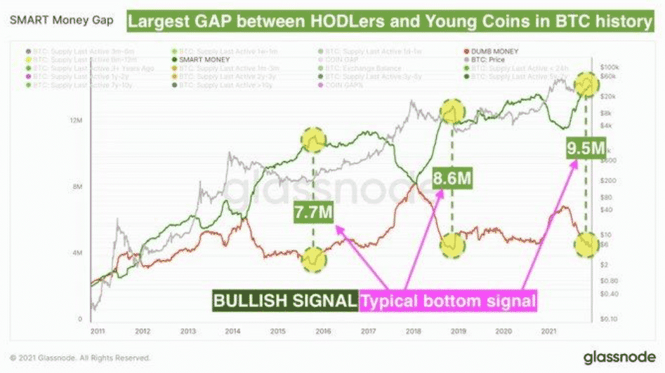 Podiel dlhodobých investorov medzitým dosiahol rekordne vysoké hodnoty v porovnaní s krátkodobými účastníkmi trhu. Podľa takzvaného indikátora „Smart Money Gap”, ktorý pozostáva z údajov on-chain analytickej firmy Glassnode, nikdy nebol väčší nepomer medzi množstvom BTC držaných „inteligentnými” a „hlúpymi” resp. dlhodobými a krátkodobými kupujúcimi.