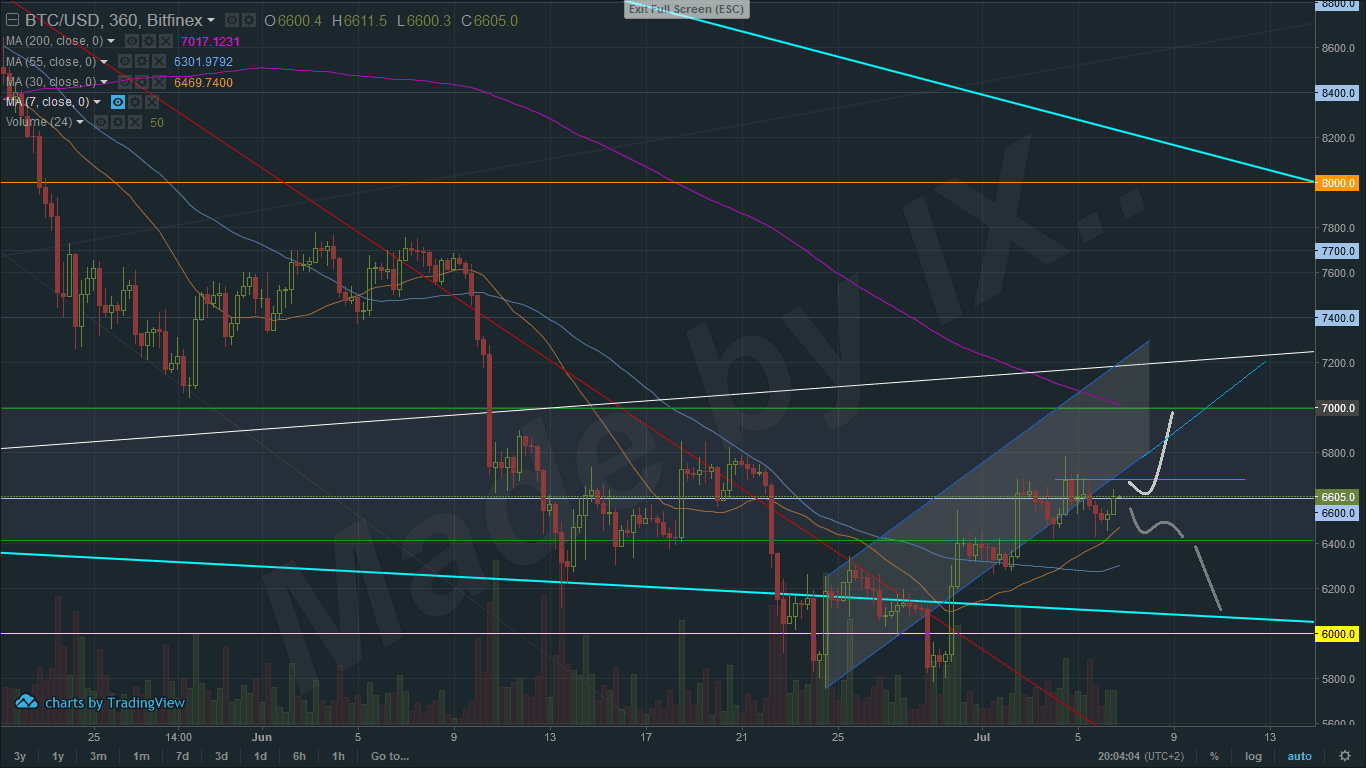Update 8.7. 6:30 – Nič nie je krajšie, ako ranný pohľad na zelený trh. Prekonanie rezistencie na 6680 $ (viď nižšie) spôsobilo menšiu pumpu, ktorá nás vyniesla až nad hladinu 6800 $. Dosiahneme predikovaných 7000 $?