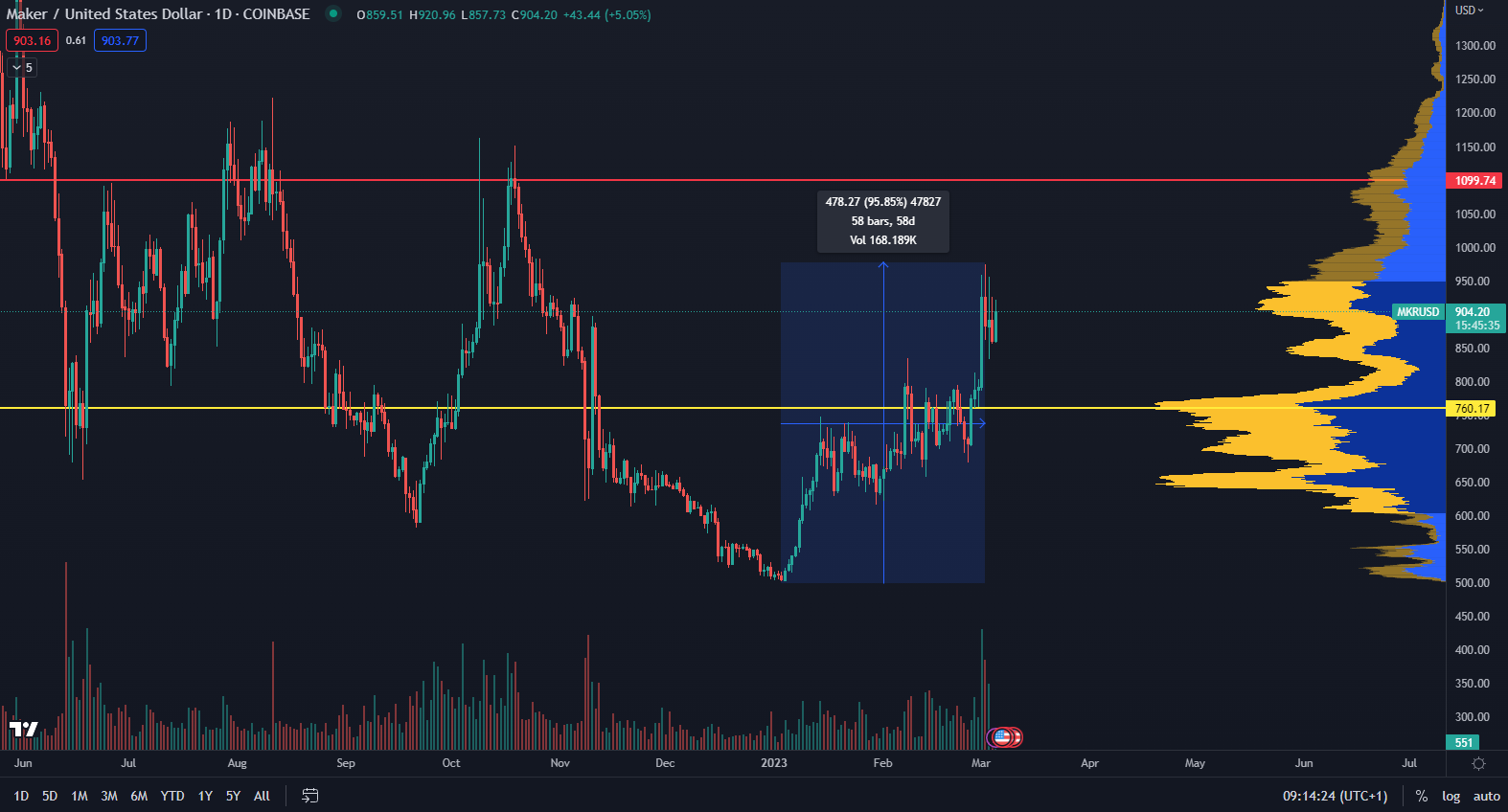 Ako vidíme na grafe TradingView, maker za posledné dva mesiace dosiahol zhodnotenie 95 %. Zároveň od polovice roka 2022 vytvára bočnú štruktúru, ktorá je ohraničená rezistenciou 1 100 dolárov a supportom 500 dolárov. Pozitívom je, že nedávny rast bol sprevádzaný silným objemom zo strany nakupujúcich. Zdá sa, že z krátkodobého hľadiska by cena mohla opäť smerovať na spomínanú rezistenciu.