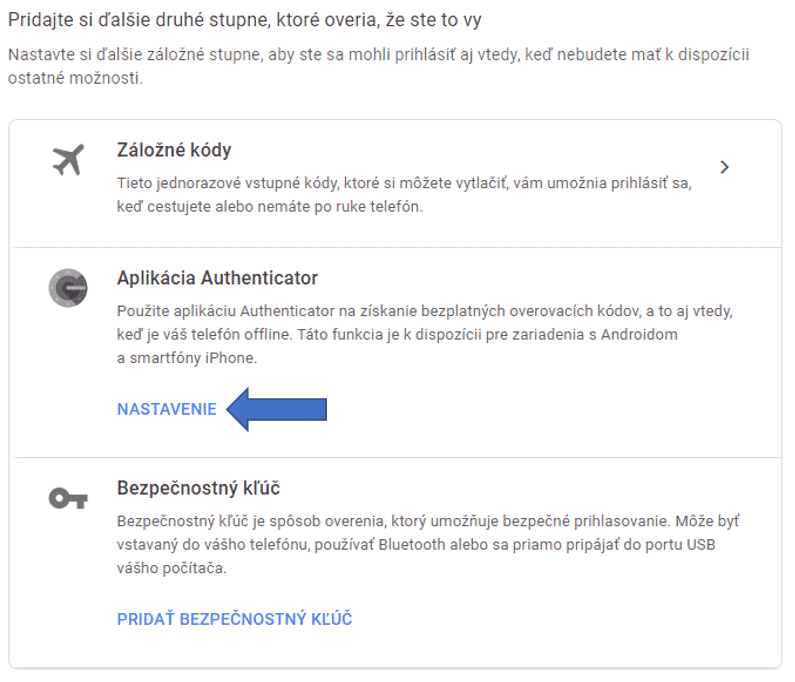 • V sekcii „Pridajte si ďalšie druhé stupne, ktoré overia, že ste to vy” zvoľte možnosť Nastavenie (pod nápisom Aplikácia Authenticator).