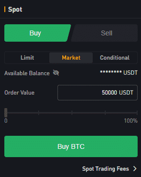 Poslednou možnosťou na spotovej burze, s ktorou viete vytvárať objednávky, je typ Conditional. Keď prednastavená spúšťacia cena (trigger price) dosiahne poslednú trhovú cenu, podmienečný trhový pokyn bude okamžite vyplnený, zatiaľ čo podmienený limitný pokyn bude zadaný do knihy objednávok a čaká na vykonanie. To znamená, že keď cena pretne spúšťaciu cenu, vyplní sa buď limitný, alebo trhový príkaz podľa toho, čo zvolíte. Nasledujúci obrázok zobrazuje túto možnosť pri order price.