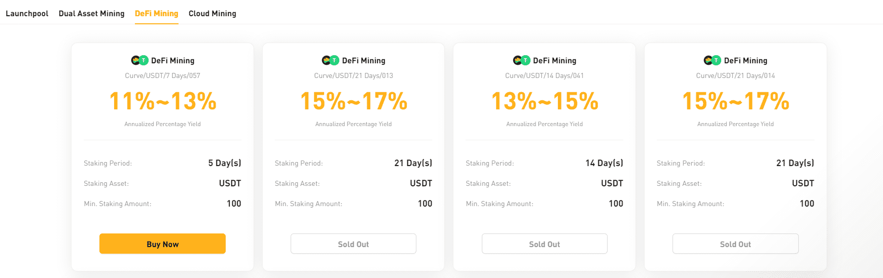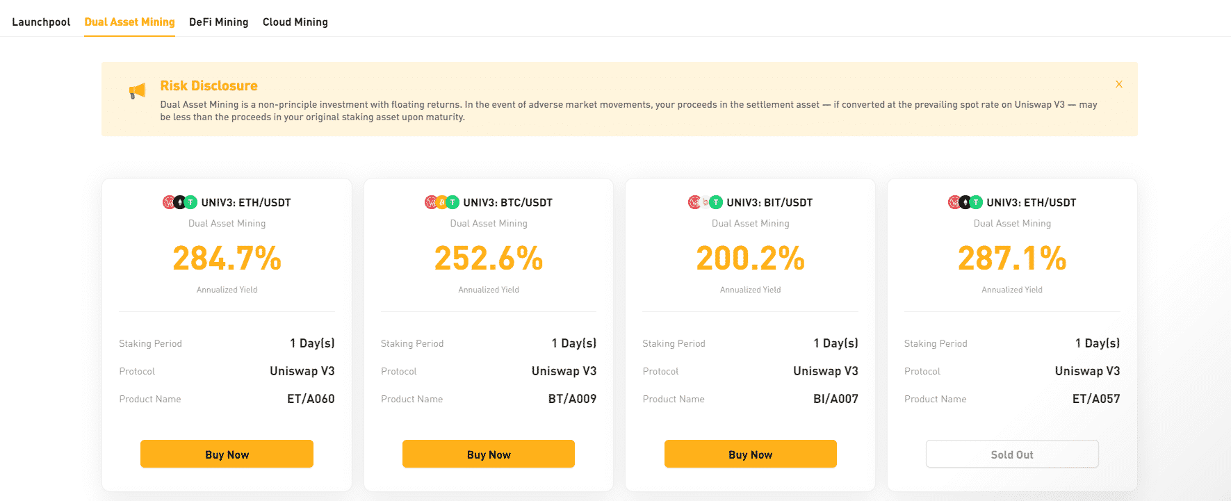 • Produkty ByFi Center: ETH Cloud Mining, CRV/USDT pool likvidity DeFi Mining a ETH/USDT Dual Asset Mining na Uniswap V3.