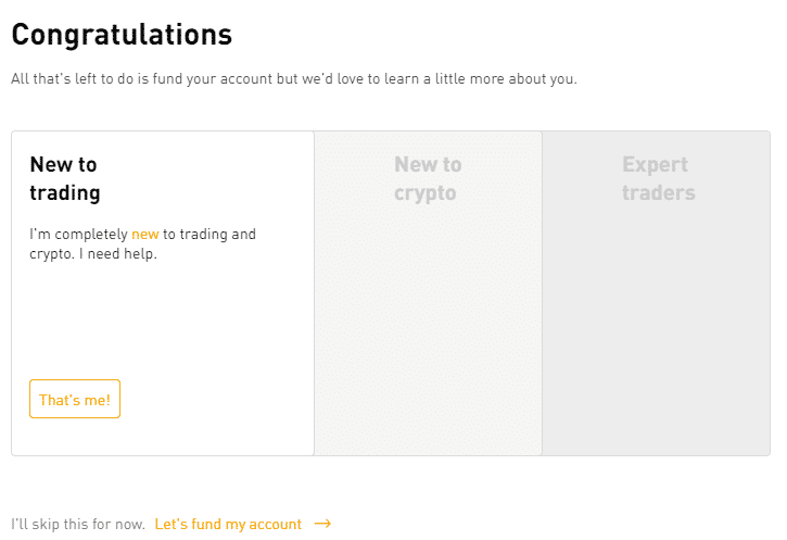 Stačí kliknúť, že nie ste rezidentom jednej z týchto krajín a následne budete presmerovaný na verifikovanie vašej e-mailovej schránky. Na e-mail vám bude zaslaný 6-miestny kód, ktorý je potrebné prepísať. Posledný krok, ktorý urobíte, je, že si vyberiete na akom leveli sa nachádzate.