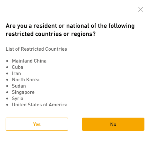 Len čo si vytvoríte nový účet, burza sa vás opýta, či nie ste rezidentom z nasledujúceho zoznamu krajín, ktorý ukazuje obrázok.