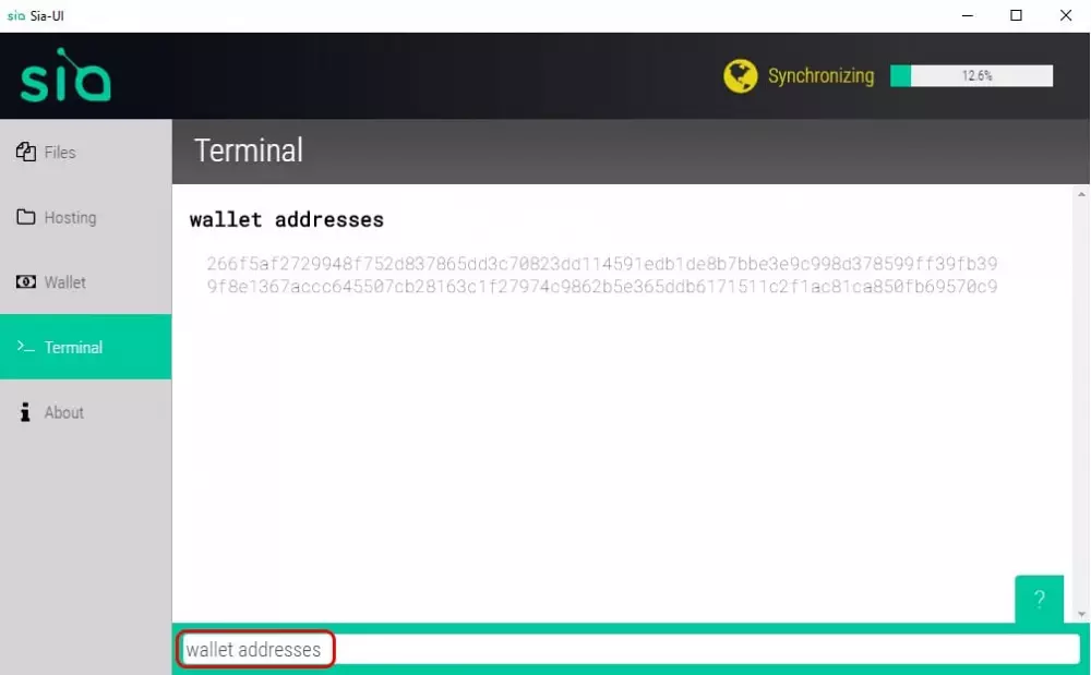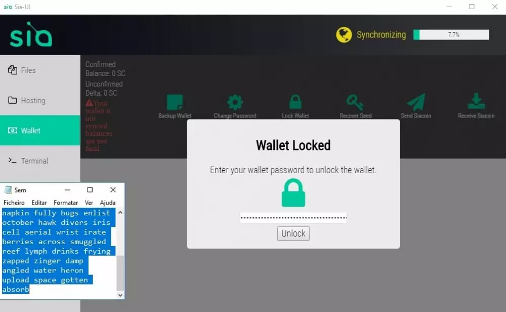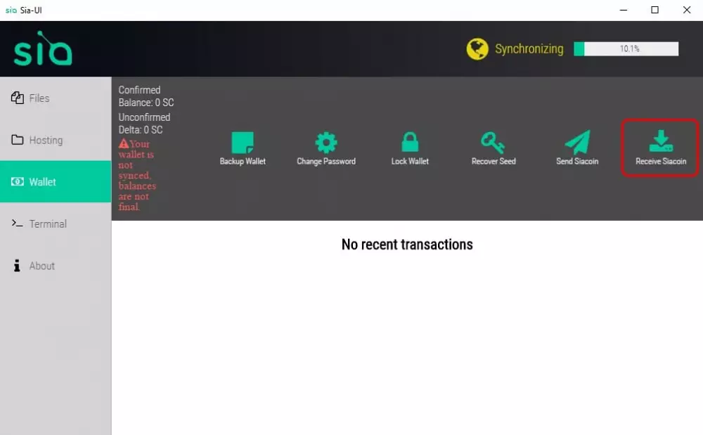 V tomto okamihu sa pravdepodobne bude Sia-UI stále synchronizovať so zvyškom siete. Nemôžete používať vašu peňaženku, kým sa tento proces neskončí, takže musíte počkať. Prvá synchronizácia môže trvať hodiny alebo dni, v závislosti od rýchlosti disku a sieťového pripojenia.