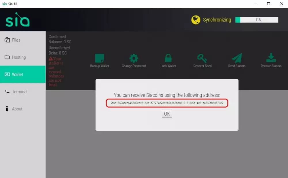 Po kliknutí na tlačidlo ”Receive Siacoin” budete môcť vidieť svoju adresu Siacoin.