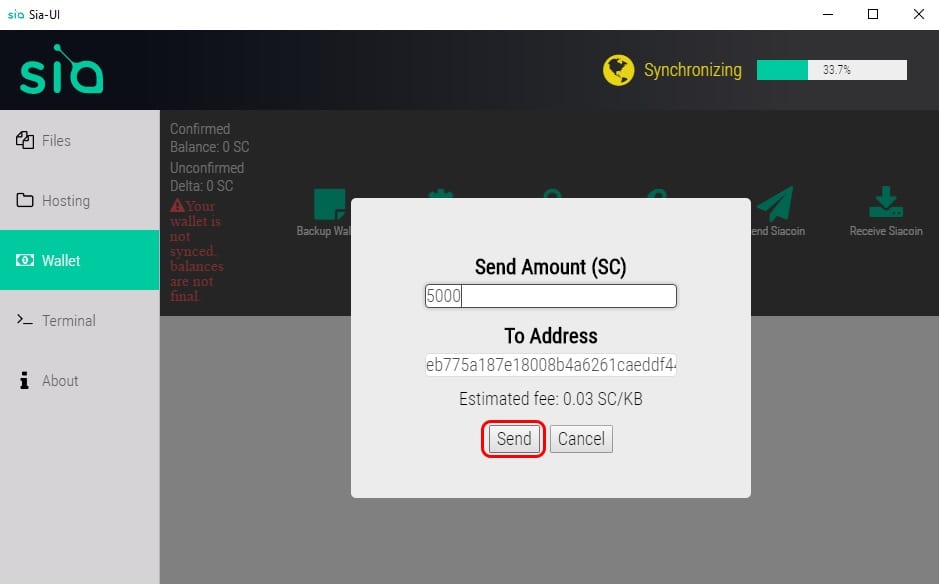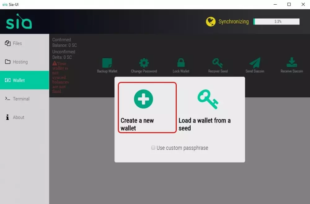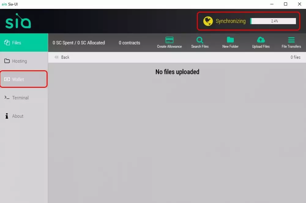 Krok 1: Po otvorení súboru Sia-UI.exe sa aplikácia automaticky otvorí. Následovne kliknite v ľavom paneli na tlačidlo „Wallet“. V pravom hornom rohu sa zobrazí pruh postupu, ktorý znázorňuje Sia-UI pokrok synchronizovať vašu aplikáciu so zvyškom siete.
