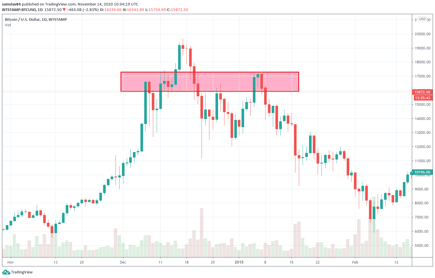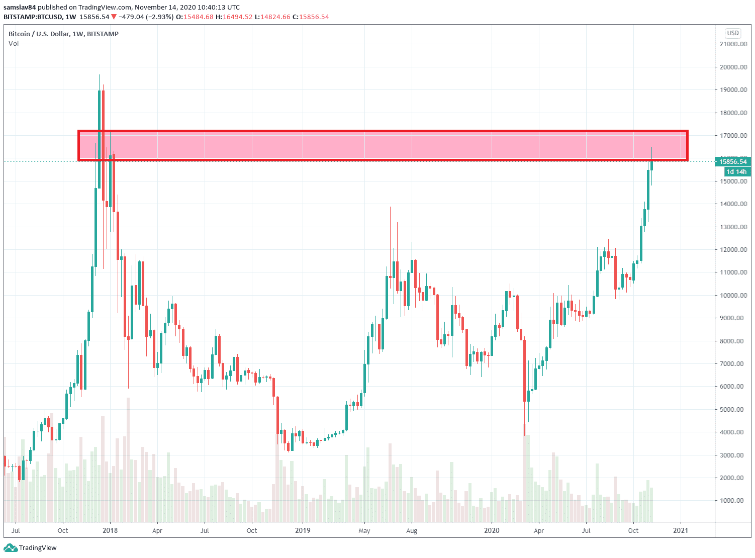 Tak ako tak, finálnou zástavkou pred novým historickým maximom bude určite práve 17 100 $. Vyplýva to z analýzy pohybov Bitcoinu z roku 2017 a 2018. Mnohí dokonca nehovoria o jednej hladine, ale o celom rezistentnom pásme, ktoré sa nachádza medzi hodnotami 16 000 – 17 300 $.
