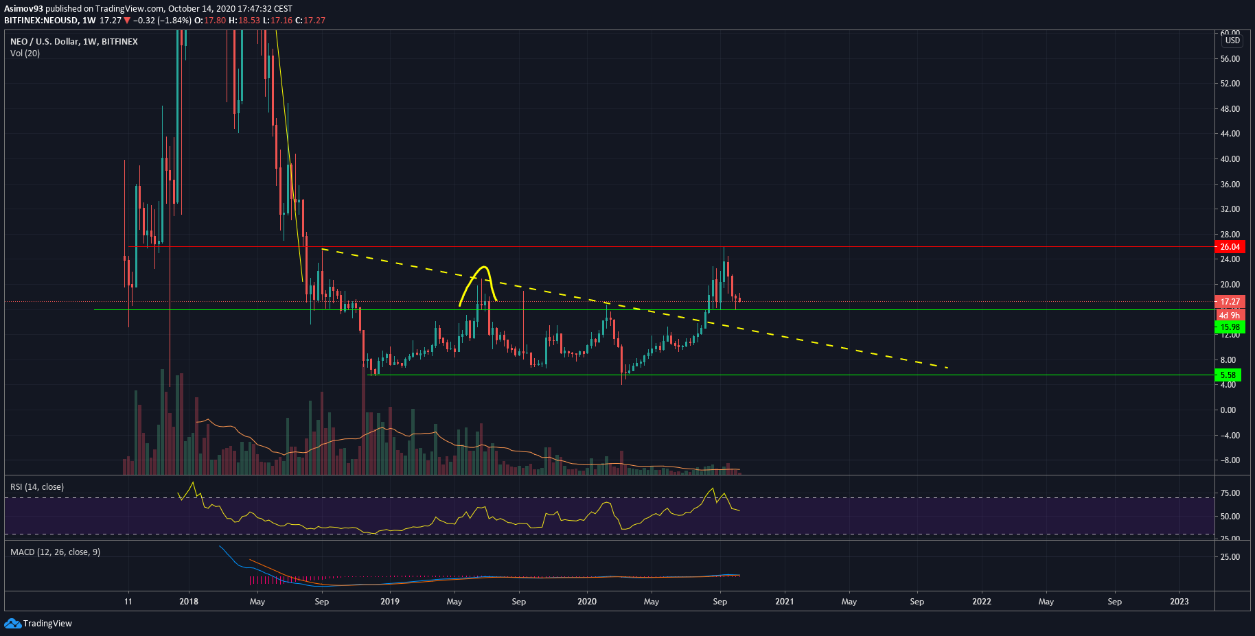 NEO je v súčasnosti na 19 mieste v kapitalizácii a má za sebou silný rok. Po predstavení cross-chain interoperability v spolupráci s Ontology táto kryptomena opäť začala byť relevantná. Odzrkadlilo sa to aj na jej cene. NEO nedávno prekonalo dlhodobý downtrend, no málokto o tom hovorí. Podobný graf má ešte jeden coin.
