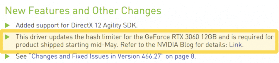 Dňa 29. apríla spoločnosť vydala ovládač GeForce 466.27, ktorý znovu zavádza obmedzovač krypto miningu RTX 3060.