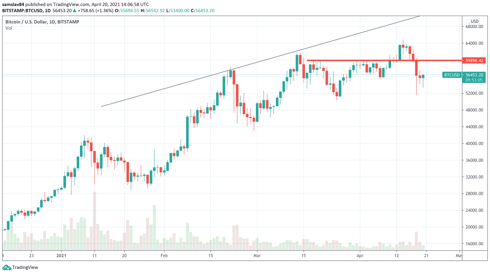 Na burze Kraken kaskáda likvidácií long pozícií v priebehu hodiny zostrelila Bitcoin o 17% na 51 500 dolárov.
