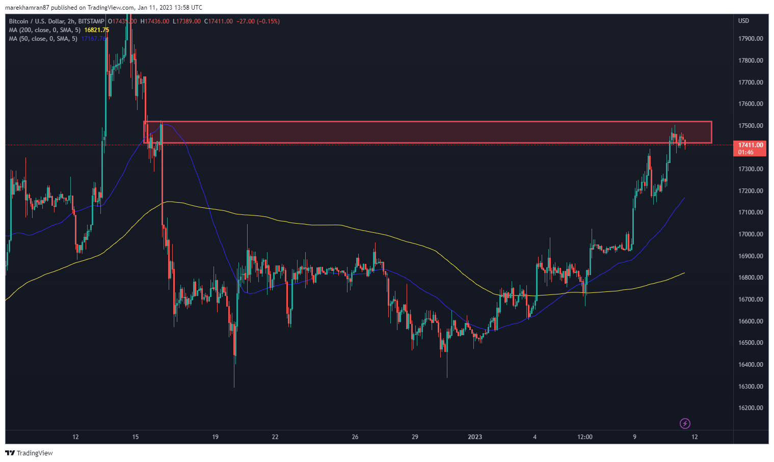 BTC sa v čase písania tohto článku obchodoval na úrovni 17 411 dolárov, čo predstavuje silnú rezistenčnú zónu. Ak by sa však potvrdila predpoveď známeho analytiku, vlajková kryptomena by vzrástla o viac ako 42 %.