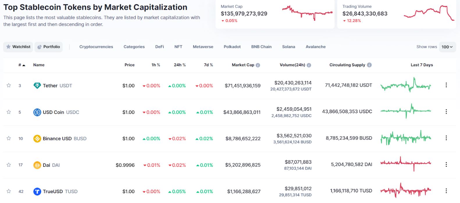 Stablecoiny. Zdroj: https://coinmarketcap.com