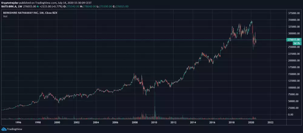V roku 1999, keď Nasdaq a Dow Jones smerovali k rekordným maximám, trhová hodnota Berkshire Hathaway na akciu klesla o 19,9%. Index S&P 500 dosiahol 21%.