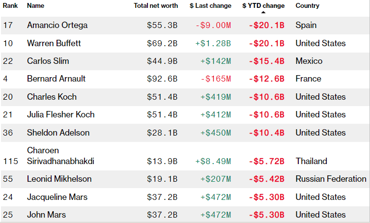 Medzi najbohatšími ľuďmi sveta má Oracle Omaha v súčasnosti titul najväčšieho porazeného. Podľa Bloomberg, Buffett a jeho bohatstvo sa tento rok prepadlo o 20,1 miliardy dolárov. On a španielsky miliardár Amancio Ortega stratili najviac.