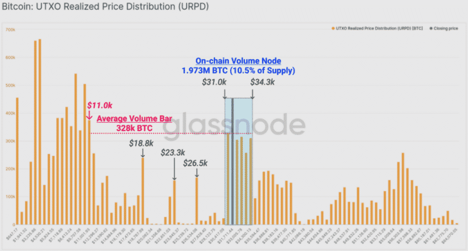 Aktuálne údaje ukazujú, že 10,5% cirkulujúcej ponuky BTC sa obchodovalo v rozmedzí od 31 000 do 34 300 dolárov, čo je najvyššia úroveň od ceny 11 000 dolárov.