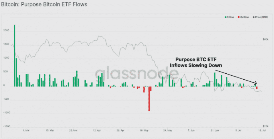 Dôkaz o poklese záujmu možno nájsť pri pohľade na trhovú cenu GBTC, ktorá sa naďalej obchoduje so zľavou -11,0% až -15,3%. Ďalší ukazovateľ je čistý prílev do Purpose ETF, ktorý sa výrazne spomalil. Údaje z Glassnode ukazujú, že ETF zaznamenal čistý odliv -90,76 BTC, čo je najväčší odlev od polovice mája.