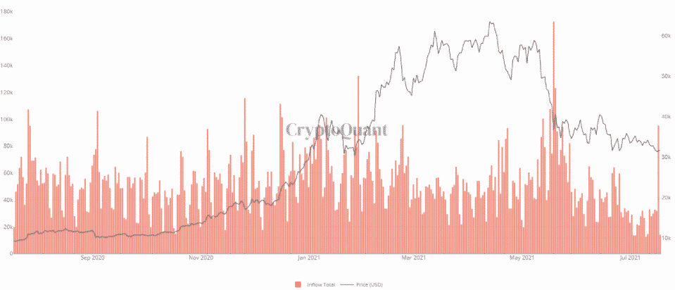Aj keď bola inštitucionálna aktivita utlmená, vklady reťazca BTC na burzy pokračujú s viac ako 28 700 BTC. Ide o najväčší príliv za viac ako mesiac a pol, ku ktorému došlo 16. júla.