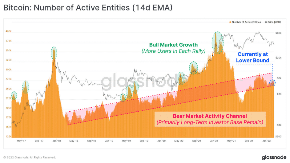 Nedostatok aktivity v reťazci je jedným z výrazných signálov medvedieho trhu s BTC. Počet aktívnych adries alebo entít je v súčasnosti na spodnej hranici medvedieho kanála trhu. Ten zobrazuje aktivitu na reťazci počas období trhov s bočným alebo klesajúcim trendom, čo naznačuje pokles dopytu a záujmu.