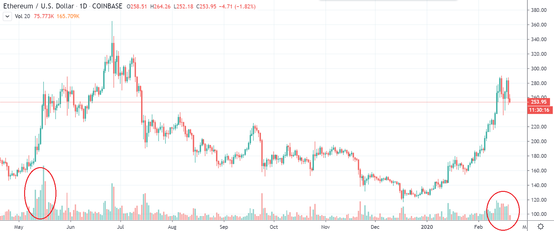 Druhý najväčší coin sa prebúdza, o tom niet pochýb. Navyše, ak sa pozrieme trochu do minulosti, v máji 2019, dva mesiace pred dosiahnutím vrcholu zaznamenalo Ethereum podobné zvýšenie volume. Nasledovala mesačná korekcia a… Viete, kam tým mierime. Však?