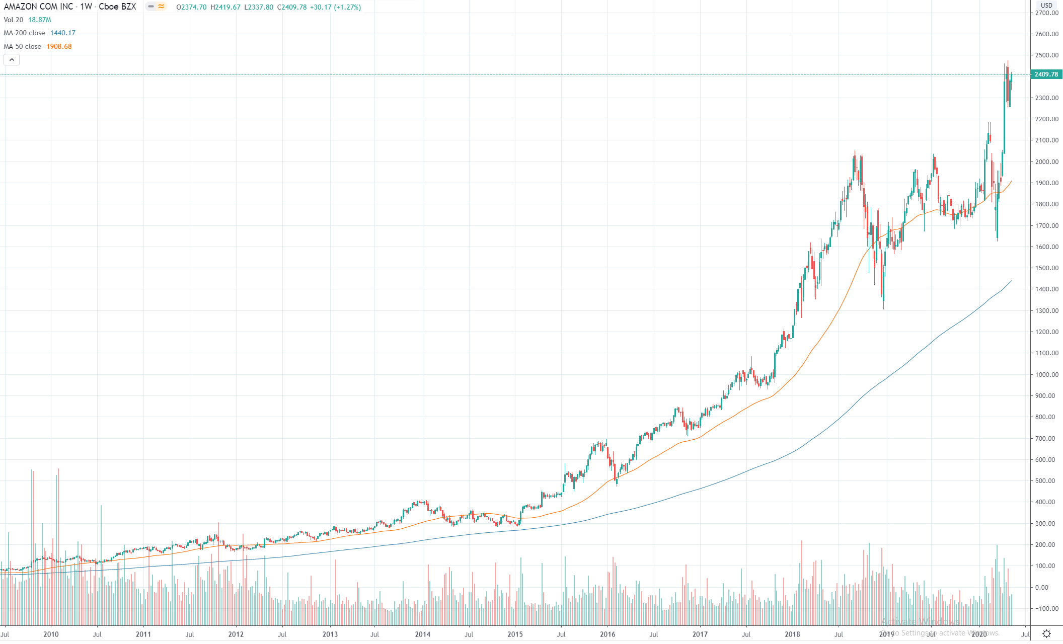Akciám Amazonu prospela aj súčasná kríza. Koronavirus totiž uzavrel ľudí vo svojich domovoch a tí tak na svoje nákupy ešte viac využívajú Amazon. Navyše, Amazonu pravdepodobne prospeje aj začínajúca obchodná vojna s Čínou:
