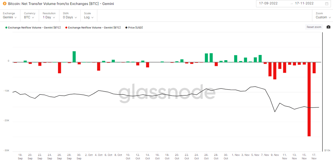 Gemini zaznamenala v priebehu jedného dňa čistý odliv až 485 miliónov dolárov, čo je najväčšia hodnota medzi kryptomenovými burzami. Celkový odliv 16. novembra dosiahol 563 miliónov dolárov, ale bol kompenzovaný prílivom vo výške 78 miliónov dolárov. Za posledný týždeň burza zaznamenala čistý odliv až 682 miliónov dolárov.