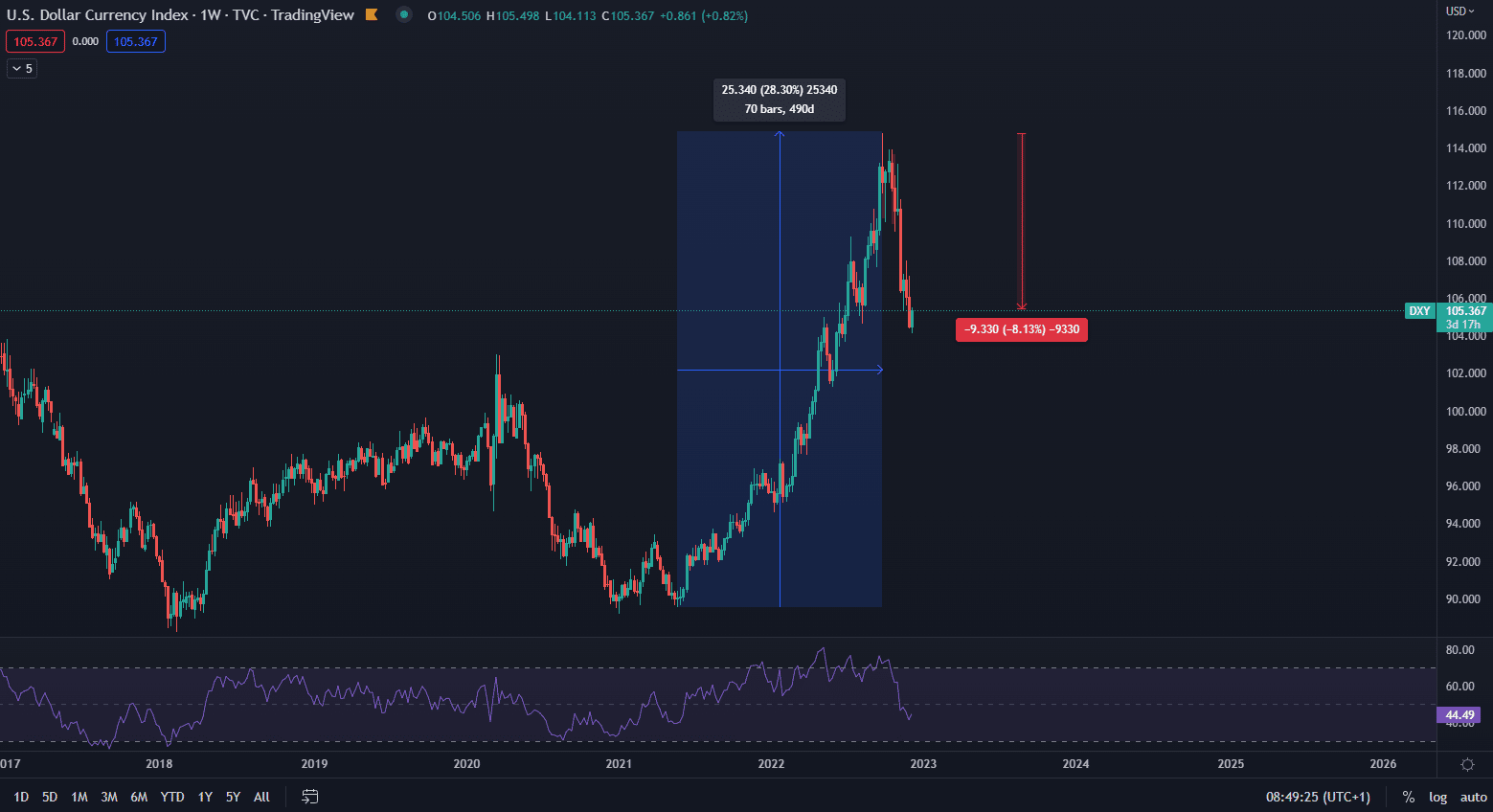 Od júna 2021 trhy čelili parabolickému rastu dolárového indexu (DXY), ktorý za toto obdobie narástol o takmer 30 %. Na maxima 114 bodov ale nastal zlom a index dodnes klesá. Zdá sa, že prudký nárast skončil a mnohé aktíva, ktoré sú vyjadrené v dolárovej hodnote, si na istú chvíľu môžu vydýchnuť.
