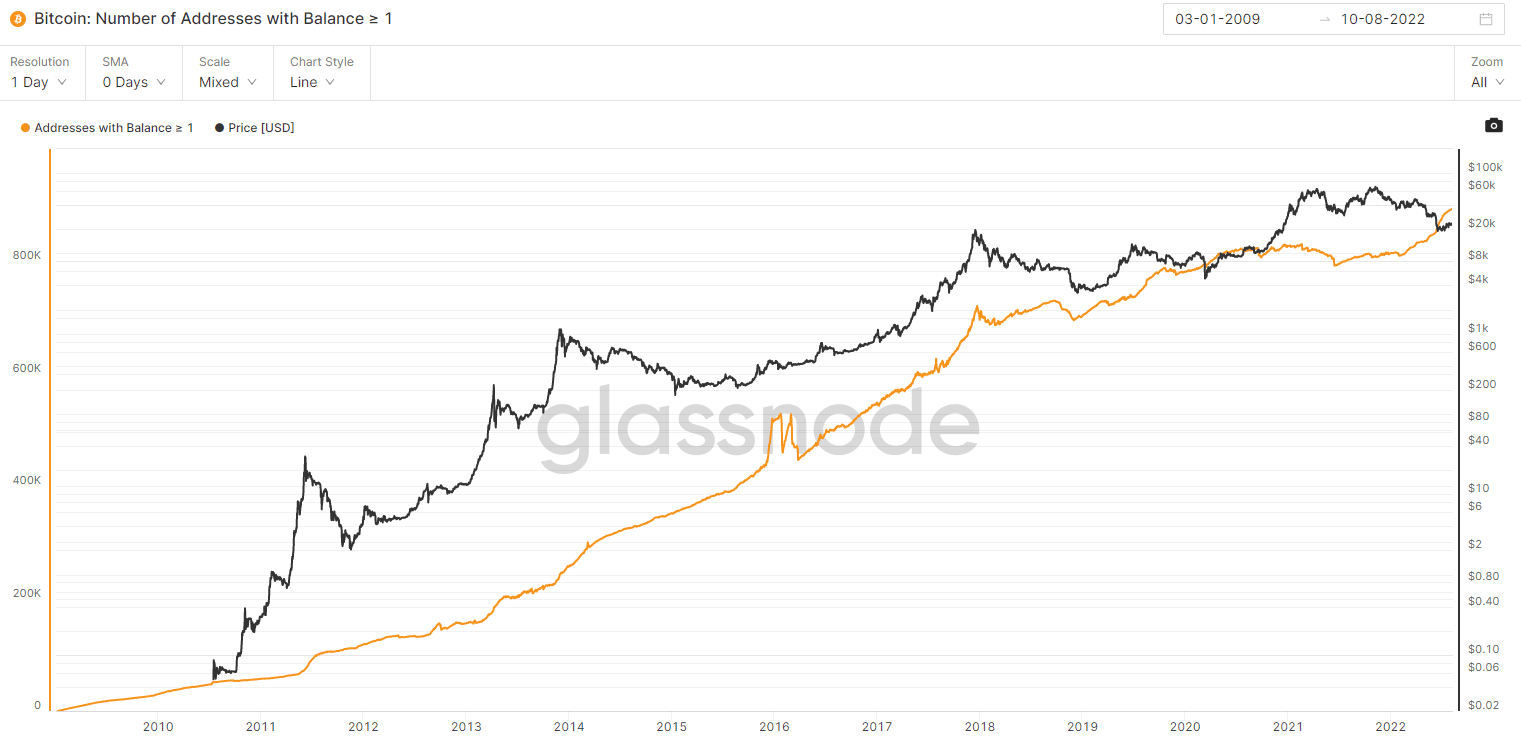 Dňa 10. augusta sa metrika, ktorá počíta množstvo bitcoinových peňaženiek s viac ako 1 BTC, dostala na rekordné historické maximum. Aktuálne v čase písania článku tento počet dosahoval 894 303 peňaženiek. Graf nižšie zobrazuje trend tejto metriky podľa Glassnode.