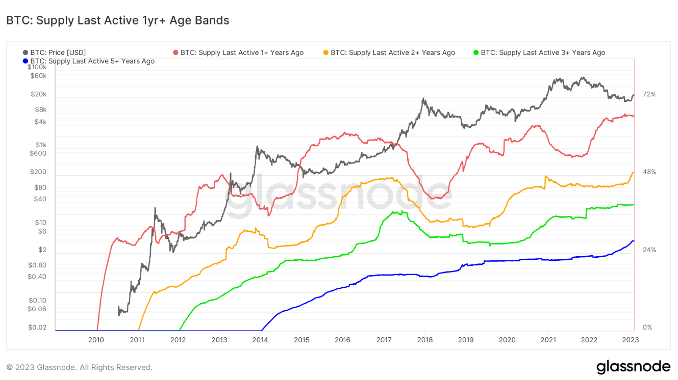 Skupina držiteľov, ktorá nepohla s mincami minimálne 5 rokov narástla na úroveň 28 %. Tieto skupiny z dlhodobého hľadiska budú dosahovať stále vyššie maximá. Jedným z dôvodov je stále väčší počet stratených mincí, ktoré umelo navyšujú hodnoty metriky. Ďalším dôvodom je rastúce uvedomenie si vzácnosti bitcoinu a jeho obmedzenej ponuky. Preto je logické, že stále menej ľudí je ochotných bitcoin predávať.