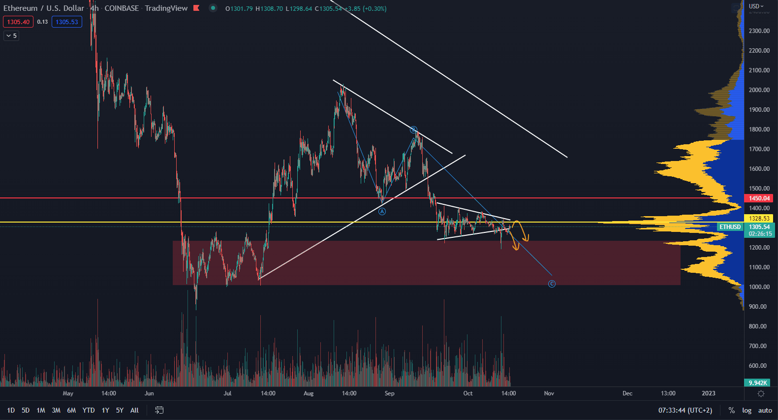 Uzatvorenie trojuholníka pravdepodobne nastane pod supportom, a to aj v prípade, že by cena krátkodobo rástla. Najvyšší bullish target budeme sledovať na rezistencii 1 450 dolárov. Cena sa vráti do pásma predošlej bočnej štruktúry medzi 1 000 a 1 250 dolárov, kde sa bude formovať ďalšie minimum. Taktiež bude podstatné sledovať, či sa minimum súčasnej ABC korekcie vytvorí nad tým posledným, keďže je reálne, že cena spadne aj pod štvorcifernú hodnotu.