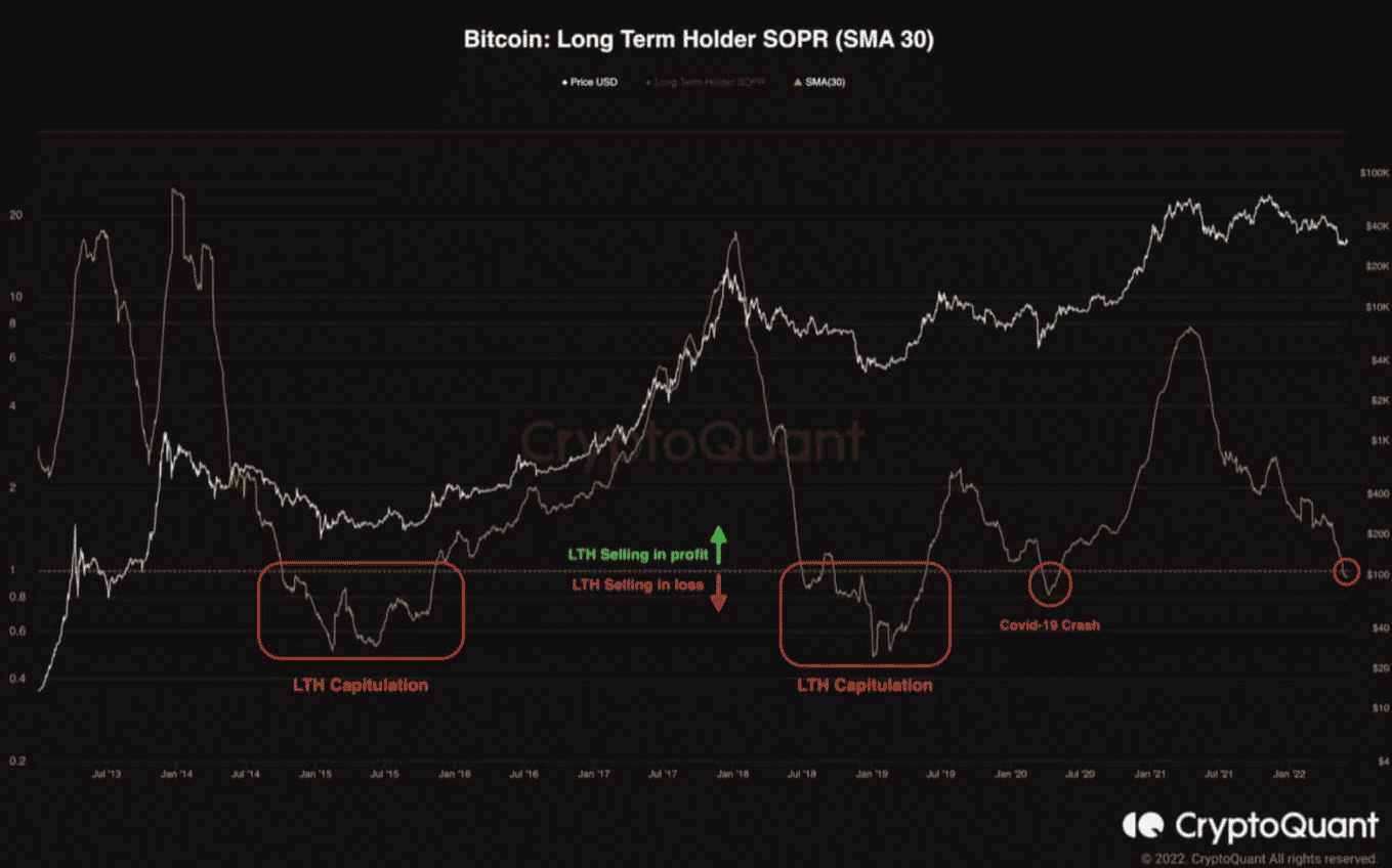SOPR dlhodobých držiteľov je metrika, ktorá meria výšku ziskov/strát, ktoré táto skupina dlhodobých držiteľov (LTH) realizuje. Je zrejmé, že počas predchádzajúcich medvedích trhov nastalo dlhé obdobie kapitulácie dlhodobých držiteľov, keďže títo účastníci odchádzali z trhu so stratou a predávali svoje nezhodnotené mince novým účastníkom, ktorí si radi kúpili podhodnotené aktívum v obrovských počtoch.