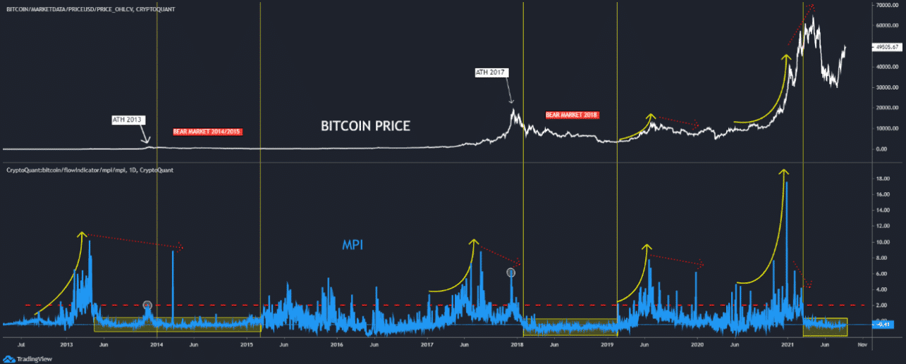 Niektorí investori radi používajú túto metriku na to, aby zistili, kedy predávať Bitcoiny. Nasledujúci graf ukazuje trend MPI v porovnaní s cenou za posledných niekoľko býčích trendov:
