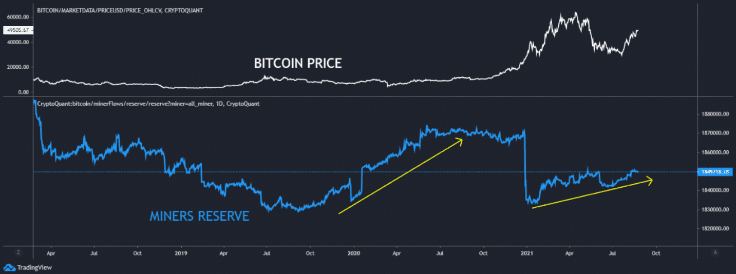 Teraz sa pozrime na ďalší graf, tentoraz pre BTC Miners Reserve. Táto metrika ukazuje počet mincí, ktoré baníci držia vo svojich peňaženkách.