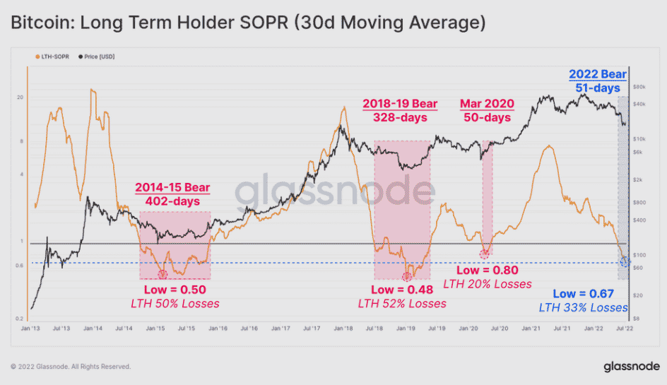 Ukazovateľ Long-Term Holder Spent Output Profit Ratio (LTH-SOPR) slúži na zachytávanie pomeru zisku LTH. Ak napríklad metrika dosahuje hodnotu 2, znamená to, že dlhodobí držitelia sa zbavujú mincí za cenu, ktorá je dvojnásobná v porovnaní s nákupnou cenou. Logicky, ak je metrika pod hladinou 1, znamená to, že investori realizujú straty, resp. predávajú mince za nižšie ceny, ako ich nakupovali.