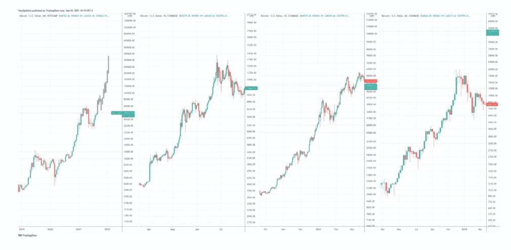 Dva stredné grafy sú na začiatku roka 2019 a na konci roka 2020, zatiaľ čo napravo je posledný úsek býčieho trhu 2017. Všetky vykazujú kľúčové podobnosti v štruktúre a úrovniach podpory v cenových akciách, ktoré nasledovali. Vyššie uvedený graf však stojí za zváženie iba vtedy, ak veríte, že fraktály v Bitcoine existujú.