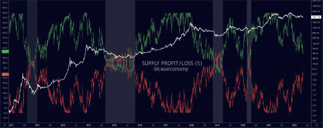 Čo je „ponuka v zisku” a „ponuka v strate”? Tieto indikátory merajú, aké percento z celkovej ponuky BTC je v zisku, resp. v strate. Tieto ukazovatele v podstate fungujú na základe historických údajov každej jednej mince Bitcoinu, ktorá sa nachádza v reťazci. Na základe týchto údajov je možné zistiť, za akú cenu sa daná minca predávala, alebo nakupovala. V prípade, že je hodnota mince menšia ako aktuálne cena BTC, minca je stále v zisku. V opačnom prípade, ak je posledná predajná cena vyššia ako aktuálna cena, znamená to, že je minca v strate.